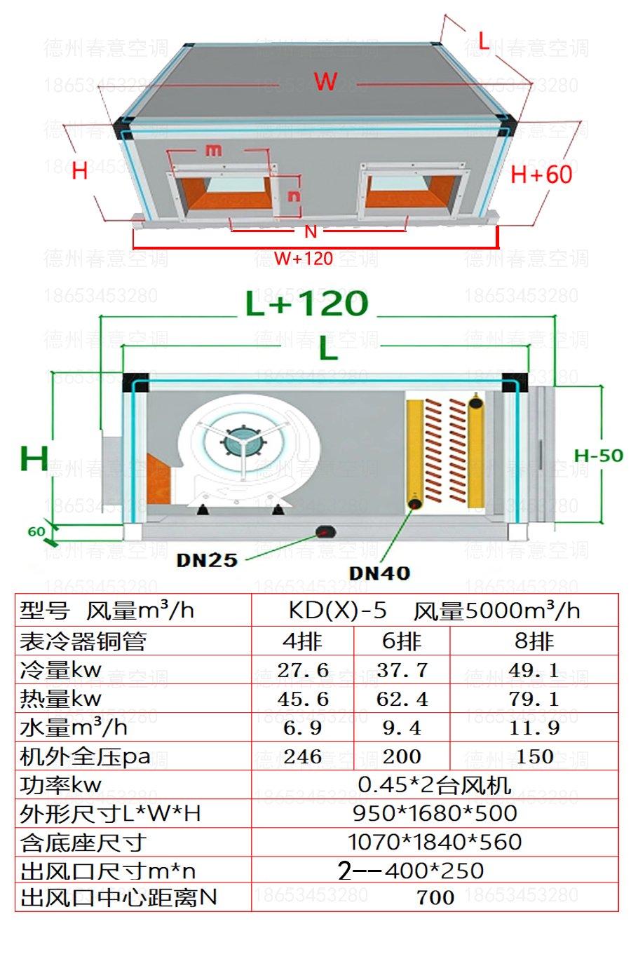 額定風量 (m3/h)首要指標。根據人均新風量(辦公室 30m3/h·人)或換氣次數(一般 2-4 次/h)計算。住宅常用 800-1500,商場/車間需 8000 以上。決定機組截面尺寸:制冷/熱量 (kW):新風工況冷量 ≈ 1.2 × 風量 × (室內外焓差)。全新風工況冷量通常比回風工況大 60%-高。決定表冷器排數(4/6/8排)機外余壓 (Pa) 必須大于風管不利環路總阻力(摩擦+局部)。一般小系統 150-250Pa,大系統 400-800Pa。決定風機電機功率